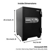The Honeywell 2106 Combination Dial & Key Steel Fire & Security Safe has been U.L. fire tested to ensure protection for up to 2 hrs during a fire reaching temperatures of 1700ºF. Your security code is protected by the "spy proof" combination lock. The Honeywell 2106 has a storage capacity of 2.1 cubic feet, dual live locking door bolts and a removable shelf to let you conveniently separate your valuables.