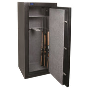This Honeywell Model 3018D Executive Gun Safe has an adjustable/removable gun rack, programmable digital lock with a handle, and 6 solid steel 1-inch diameter locking bolts. The interior offers 9.93 cubic feet of storage, and the exterior of the safe has scratch resistant powder coat finish. Has pre-drilled holes for mounting down to the floor or the wall, mounting kit is included. The outside dimensions are 59.1"H x 25.2"W x 19.7"D. The inside dimensions are 56.3"H x 22.4"W x 13.6"D. Backed by a 7-year limited warranty.