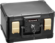 The Honeywell 1102 Fire/Water Chest features a storage capacity of .15 cubic feet. Secure unprecedented levels in peace of mind with this chest's ability to withstand a fire of up to 1550F for thirty minutes. The addition of a waterproof seal and two side latches guards against emergency sprinklers, floods and various other forms of water damage. These features make it an ideal candidate for stashing all of your personal documents, digital media, and various other valuables. The box is also large enough to store Standard # 10 envelopes when they are filed upright. For security measures, this box utilizes a key lock system. A carry handle is also included and adds even more versatility to an already flexible product.