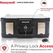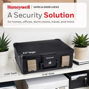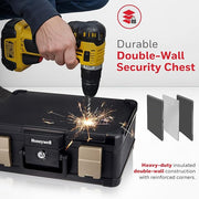 The Honeywell Model 1103 Fire/Water Chest features a storage capacity of .27 cubic feet. Secure unprecedented levels in peace of mind with this chest's ability to withstand a fire of up to 1550F for thirty minutes. The addition of a waterproof seal and two side latches guards against emergency sprinklers, floods and various other forms of water damage. These features make it an ideal candidate for stashing all of your personal documents, digital media and various other valuables. The box is also large enough to store your 8 1/2' x 11' paper flat. For security measures, this box utilizes a key lock system. A carry handle is also included and adds even more versatility to an already flexible product.
