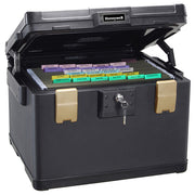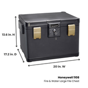 The Honeywell 1108 Fire/Water Large File Chest features a storage capacity of 1.06 cubic feet. Secure unprecedented levels in peace of mind with this chest's ability to withstand a fire of up to 1700F for one hour! The addition of a waterproof seal and two side latches guards against emergency sprinklers, floods and various other forms of water damage. This particular safe was built to withstand 48 hours of continuous water damage in up to 39 inches of water. The box is also large enough to store your legal letters and A4 Size Hanging File Folders. For security measures, this box utilizes a key lock system.