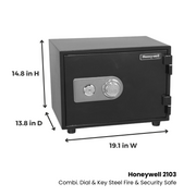The Honeywell 2103 Combination Dial & Key Steel Fire & Security Safe has been U.L. fire tested to ensure protection for up to 1 hour during a fire reaching temperatures of 1700ºF. Your security code is protected by the "spy proof" combination lock. The Honeywell 2103 has a storage capacity of 0.61 cubic feet, dual live locking door bolts, and a removable shelf to let you conveniently separate your valuables.