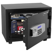 The Honeywell 2113 Digital & Key Steel Fire & Security Safe has been U.L. fire tested to ensure protection for up to 1 hour during a fire reaching temperatures of 1700ºF. Coated in steel, this safe utilizes a programmable digital keypad that effectively allows users to program their own personal three to eight digital pass code. The Honeywell 2113 has a storage capacity of 0.61 cubic feet, dual live locking door bolts and a removable shelf to let you conveniently separate your valuables.