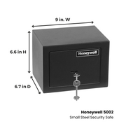This Honeywell 5002 Small Steel Security Safe features 2 solid steel live lock bolts, with a 0.19 cubic feet storage capacity, solid steel cabinet and door design, concealed hinges and recessed doors to resist against prying. The Honeywell safe product line provides safety and security for your essential documents and most valuable possessions while affording you the peace of mind that comes from being prepared in the event of a disaster, theft, or an invasion of your home or office. There is a scratch-resistant powder coat finish. Has mounting capabilities with the predrilled holes and mounting kit included. Backed by a 7-year limited warranty.