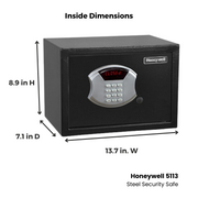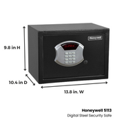 The Honeywell Model 5113 Steel Security Safe features a storage capacity of .50 cubic feet. This unit is particular in that it features an abundance of versatile and convenient options that bolster its effectiveness. A programmable digital lock assisted by motorized door locks assures users a personal and private method of accessing their items. Surrounded in steel, this safe is incredibly durable and particularly efficient in preventing criminal activity. Further distancing it from similar safes, the 5113 utilizes a recessed door, concealed hinges and a rear panel to prevent unwarranted tampering. This product also features a wealth of versatile installation options. An included kit allows you to select a shelf or a position in the floor to bolt and secure your safe. Honeywell has proven themselves as an invaluable and dependable brand that successfully blends flexible options with resilient technology. The product includes a mounting kit, adjustable shelf and four ""AA"" batteries.